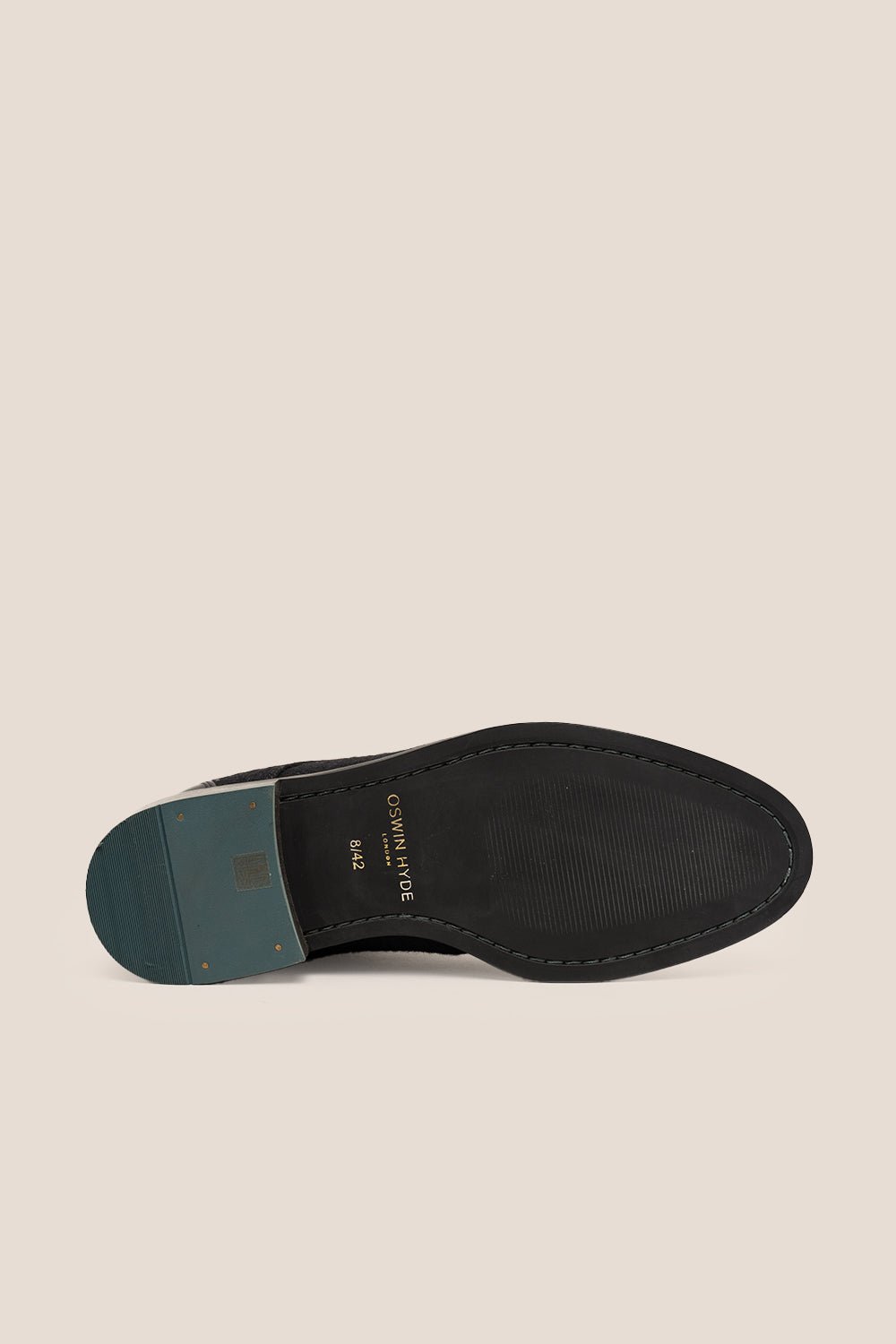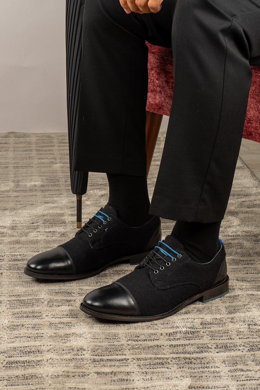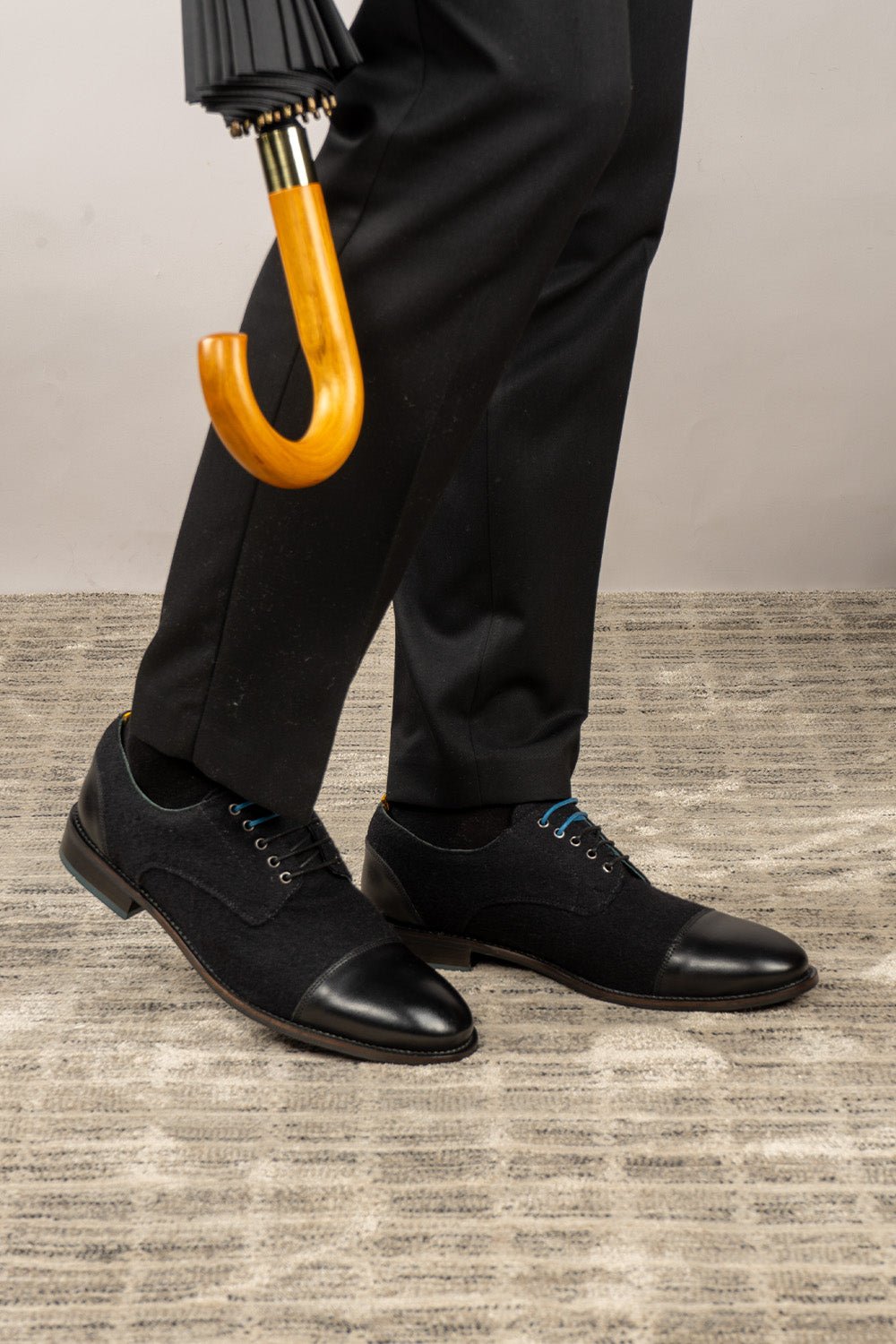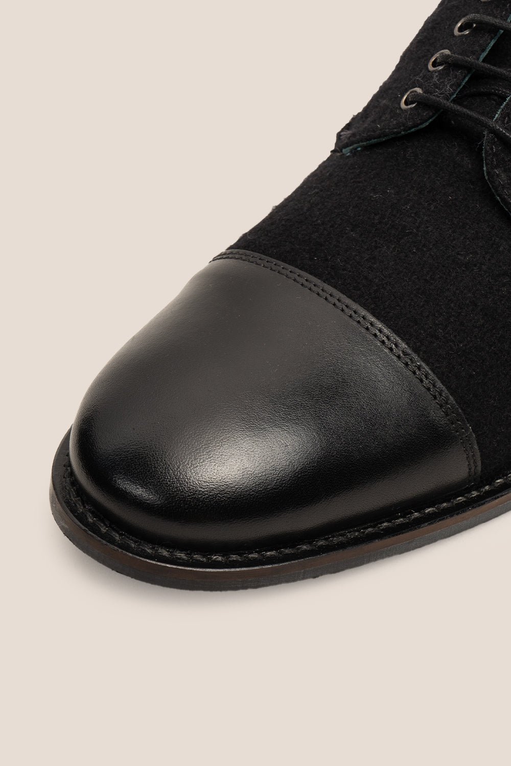 Introducing Thomas Black, an exquisite men’s shoe crafted from black leather and distinguished by a capped toe and delicate felt details. Exuding sophistication and luxury, it is the perfect choice for the modern gentleman.